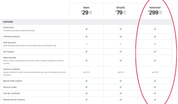 The Advanced Shopify subscription plan costs $299/month and works best for businesses that handle high order volume. This subscription offers all of the features of the Shopify plan plus a much broader, more advanced set of features. It comes with fifteen staff accounts and allows inventory tracking across eight different locations. This plan includes custom reports that you can modify. You can also create custom reports with Shopify’s filtering and editing features. Another benefit that is important to mention is that you get access to third-party shipping calculations that display your shipping carrier’s negotiated rates at check out.
