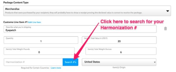 To identify your product’s Harmonization Number, you may visit the United States Census Bureau Schedule B Search Engine . From this site you can enter the details of your product into the search bar. From there, you can search Harmonization Numbers by selecting the blue “ Search #’s” button in the Customs section, as seen here:
